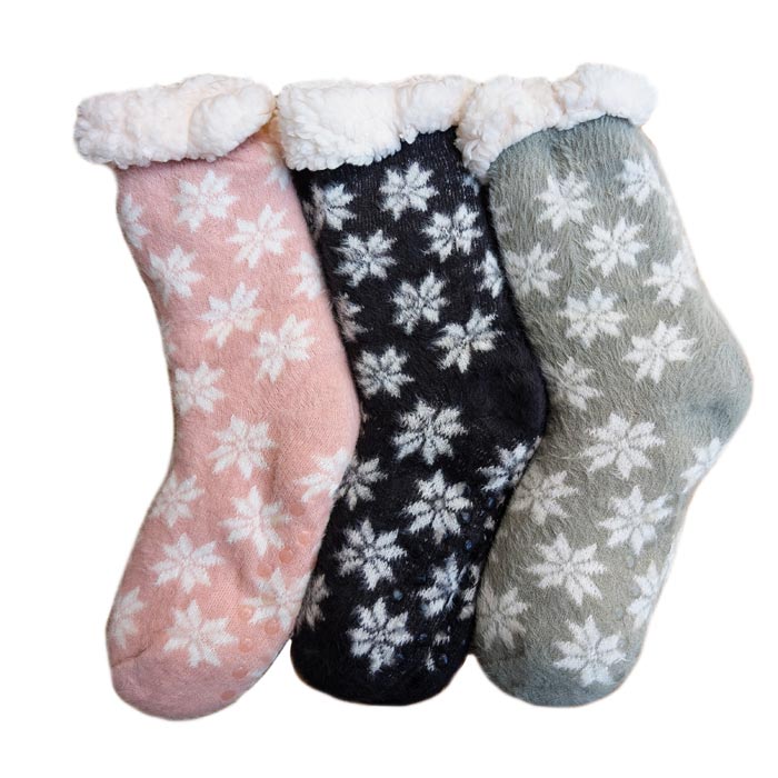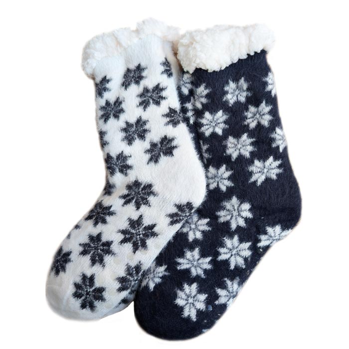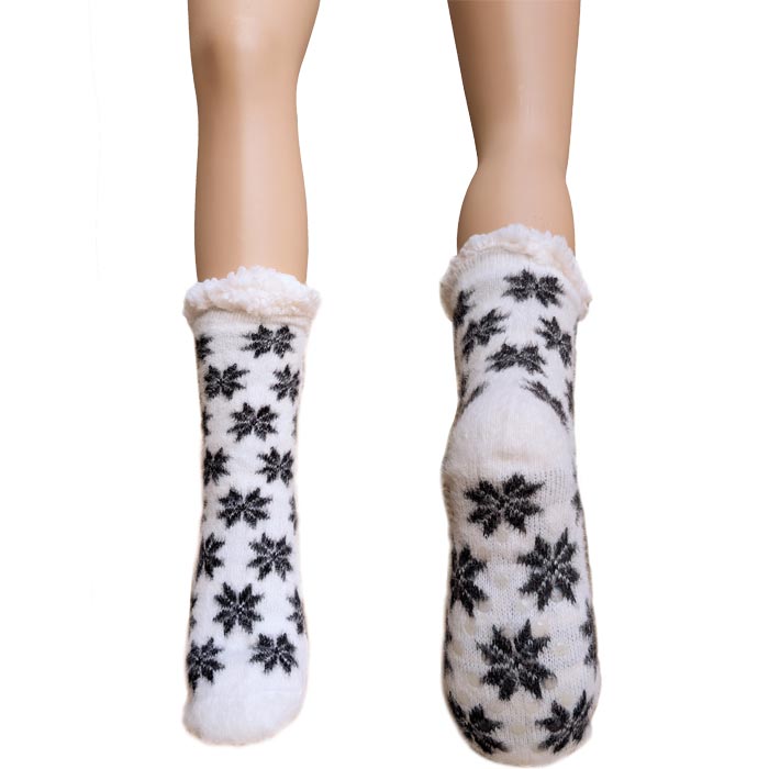 Chausson chaussettes très chaude, douce "type polaire" avec gomme antidérapante. Chaussette motifs avec "flocons" sur l'ensemble. Voir photos pour les couleurs et motifs. Bord côte molletonné retourné. Intérieur molletonné grosse bouclette, ultra douce. 2 tailles : 36/38 et 38/41.