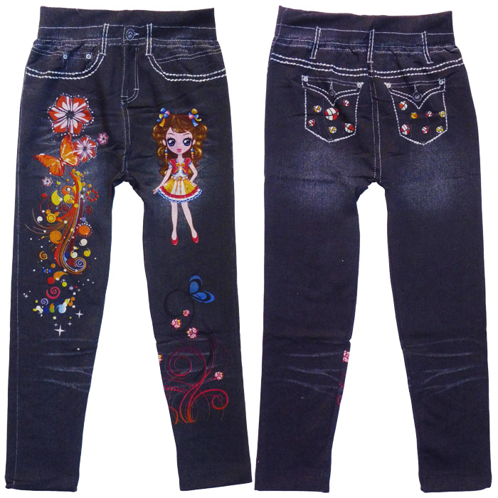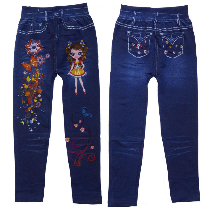 Leggings enfant effet "jeans délavé". Élastique à la taille. Imitation jean 's avec fausses poches à l'arrière et à l'avant. Motif "fleurs et personnage" sur le devant. 3 tailles (S-M-L).